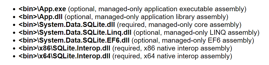 <ItemGroup> <Content Include="x64\SQLite.Interop.dll" /> <Content Include="x86\SQLite.Interop.dll" /> </ItemGroup>